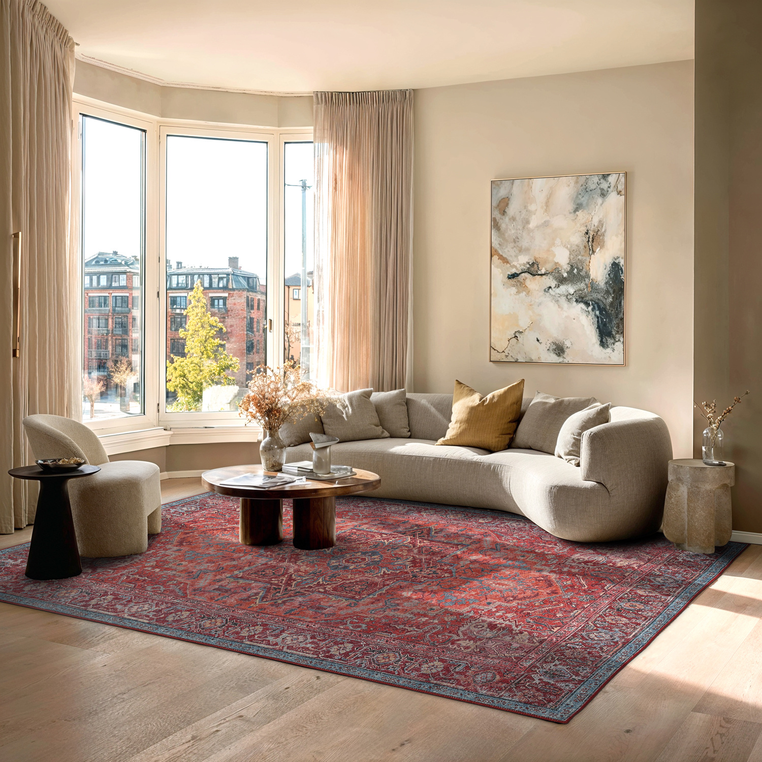 Vytvorte nadčasovú atmosféru doma s týmto plochým tkaným kobercom v elegantnom vintage štýle. Jemný a odolný dizajn robí koberec ľahkým na umiestnenie a údržbu, zatiaľ čo opotrebovaný vzor s kúzlom pridáva teplo a charakter miestnosti. Ideálny pod jedálenským stolom, v obývacej izbe alebo v predsieni – koberec, ktorý kombinuje praktickú funkčnosť s klasickým dizajnom.