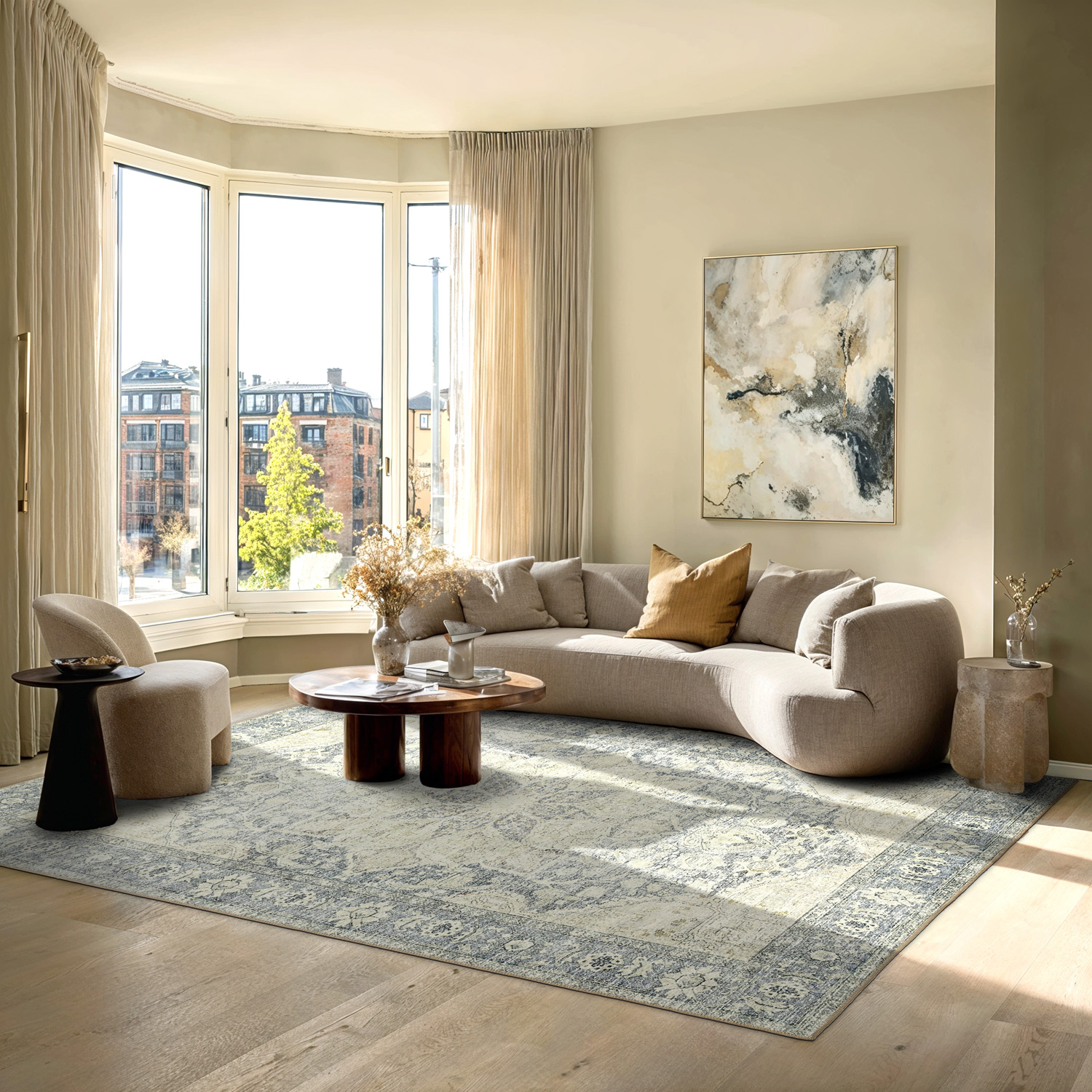 Vytvorte nadčasovú atmosféru doma s týmto plochým tkaným kobercom v elegantnom vintage štýle. Jemný a odolný dizajn robí koberec ľahko umiestniteľným a udržiavateľným, zatiaľ čo opotrebovaný vzor s kúzlom pridáva teplo a charakter miestnosti. Ideálny pod jedálenským stolom, v obývacej izbe alebo v predsieni – koberec, ktorý kombinuje praktickú funkčnosť s klasickým dizajnom.