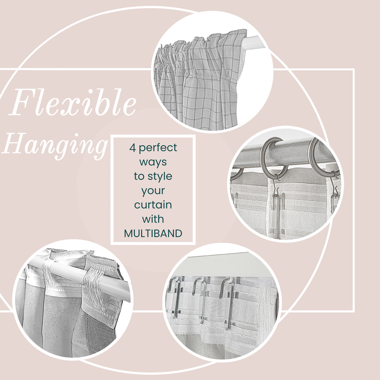 Všetky závesy od Trendcarpet prichádzajú s multifunkčným pásom, ktorý vám umožňuje zavesiť ich na akýkoľvek typ závesného tyče a poskytuje rôzne možnosti prezentácie pre vaše závesy.
